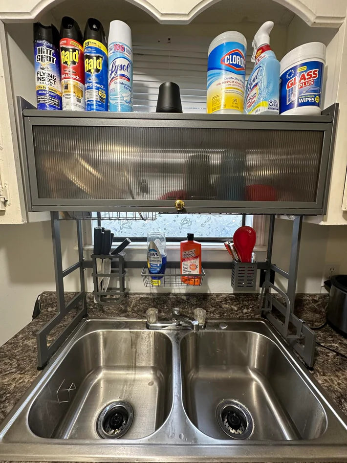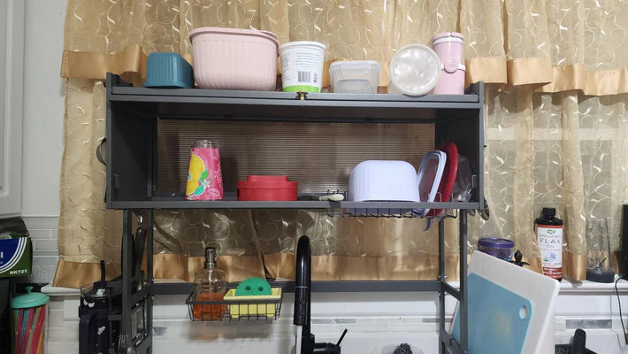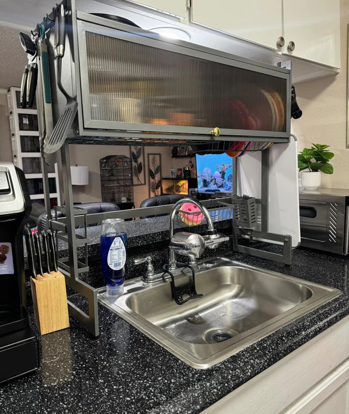 Aprovecha bien el espacio con este moderno escurridor de platos elevado CON PUERTA que te ayudará a maximizar cada centímetro. ¡Oculta todo el desorden de platos!